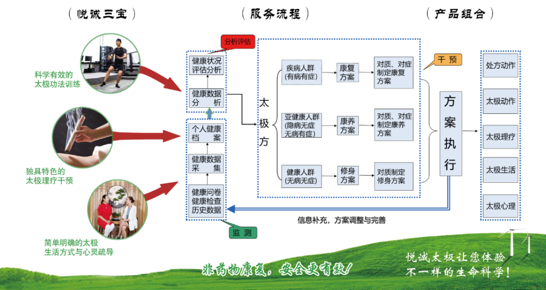 中心研发的“太极健康管理”生命护航体系可满足太极拳爱好者、亚健康人群及慢性病患者的养生、调理、康复需求。个性化产品组合太极方,集科学有效的太极功法训练、独具特色的太极理疗康复、体贴到位的太极生活方式与心灵疏导于一体,因对“四高”一胖、老年肌少症、抑郁症、心脑血管病的预防及干预,已经显现出奇特的效果,被誉为“悦诚三宝”。